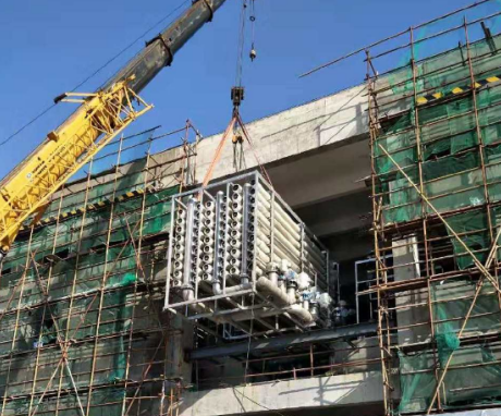 某污水處理廠新建了大型廠房,并采購(gòu)了八臺(tái)關(guān)鍵設(shè)備——四臺(tái)反滲透裝置 + 四臺(tái)超濾機(jī)組,就在準(zhǔn)備將這些設(shè)備安裝到廠房?jī)?nèi)部時(shí),卻犯了難,因?yàn)榻ㄖS房的門框大小已經(jīng)固定,他們現(xiàn)場(chǎng)平時(shí)吊重用的吊車無法順利駛?cè)脒@個(gè)門框內(nèi),就在這緊急之時(shí),負(fù)責(zé)吊裝任務(wù)的工作人員利用了多種起重工具,成功解救了吊裝難題。